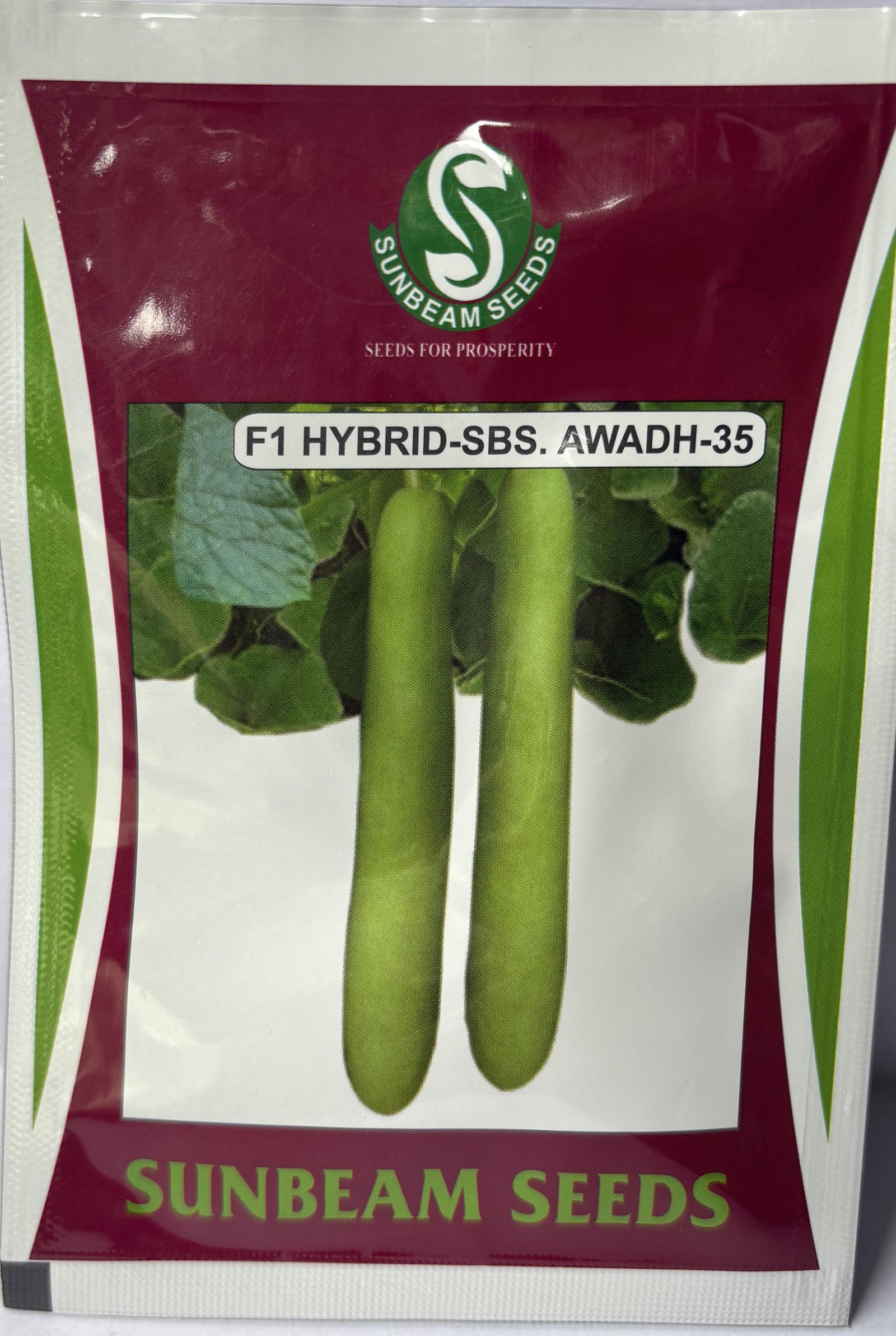 F1 Hybrid SBS Awadh-35 is a premium bottle gourd (Lagenaria siceraria) variety bred by Sunbeam for high-yielding, early-harvest performance. Its uniform fruit shape, attractive color, and excellent field adaptability make it a favorite among farmers targeting both local and wholesale markets.