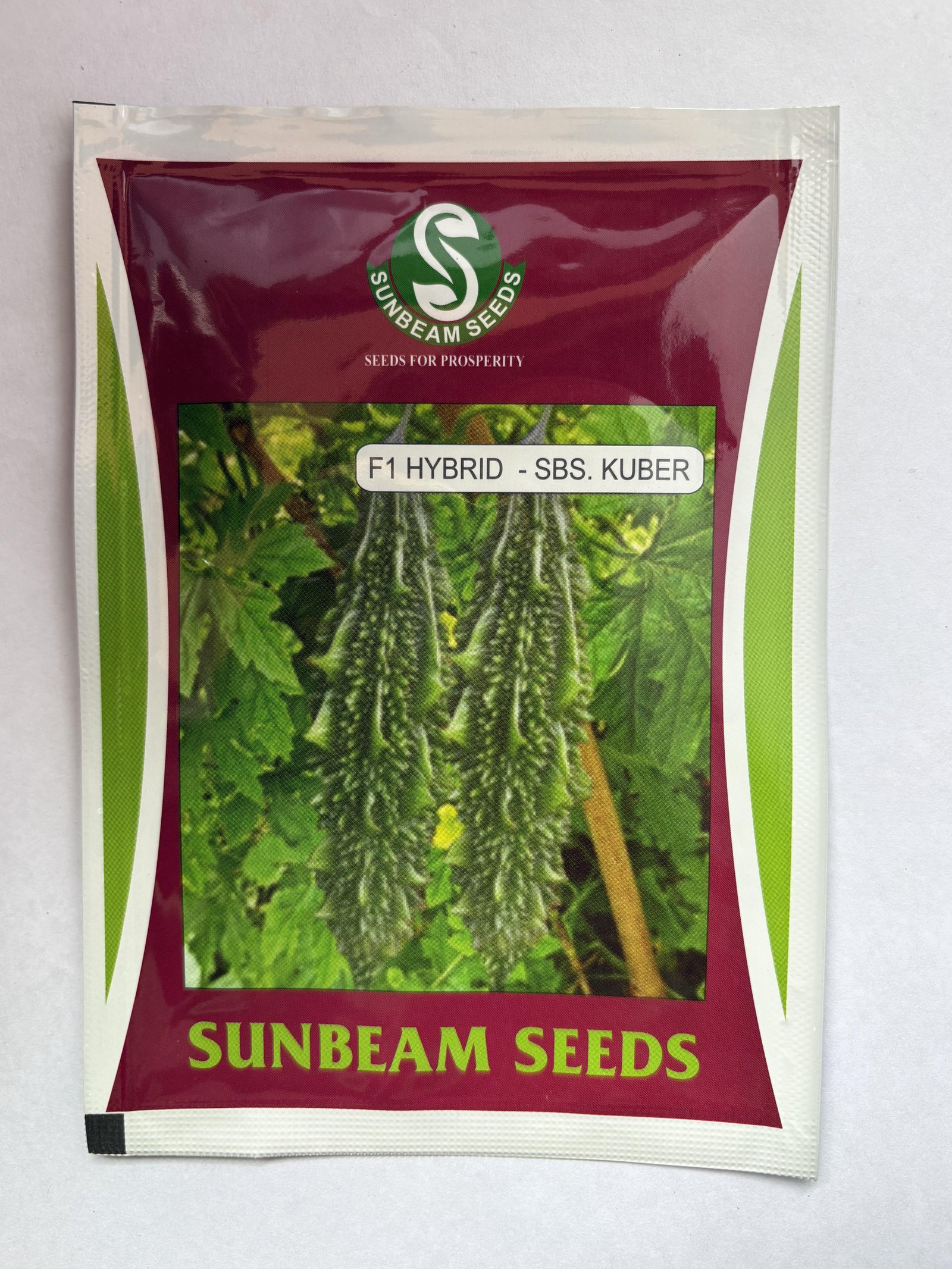 SBS. Kuber is a vigorous F1 hybrid bitter gourd developed by Sunbeam for professional growers seeking consistent quality and high returns. This variety features strong plant vigor with good branching and early maturity (45–50 days after sowing). Fruits are medium-long, dark green, glossy, and uniform with attractive ridges. It offers an excellent fruiting pattern, good transport tolerance, and a prolonged harvesting window. SBS. Kuber performs well in diverse climates and shows tolerance to common diseases, making it a reliable choice for high-yield bitter gourd cultivation.